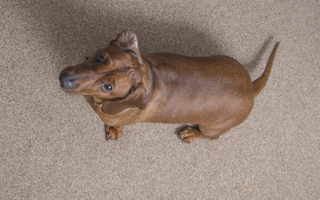 かわいい茶色のダックスフント犬が座って見上げる の写真素材 画像素材 Image