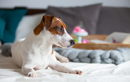 犬 マシュマロとスタンド ラベンダーとベッドの上のボードに本支店の写真 の写真素材 画像素材 Image
